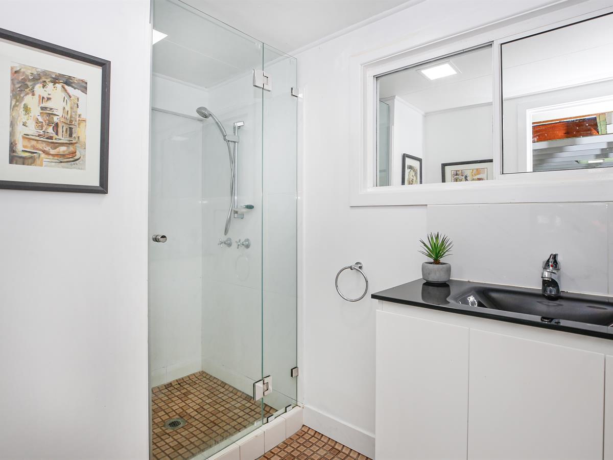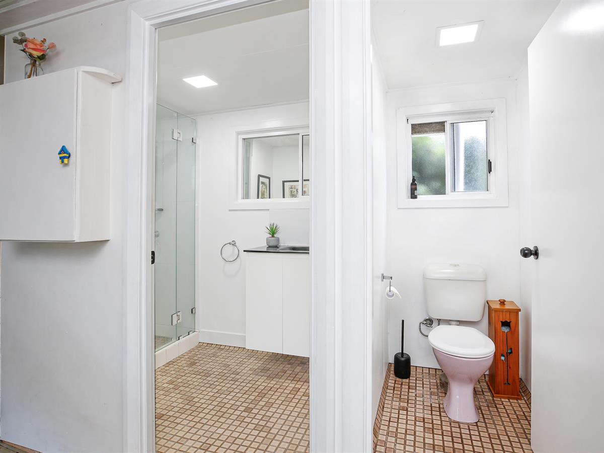 Bathroom with a separate toilet. A well-sized laundry with extra storage space can also be used as a hobby room or workshop. The first level provides a cozy, open living space with a modern kitchen, breakfast bar, and direct access to the Balcony—the perfect place to share a drink and meal with friends and family. The beautiful polished timber floor gives the place a relaxed feeling. Walk up the stairs to a generously sized upper floor with two bedrooms fitted with built-in wardrobes and a sunroom currently used as a study/office.