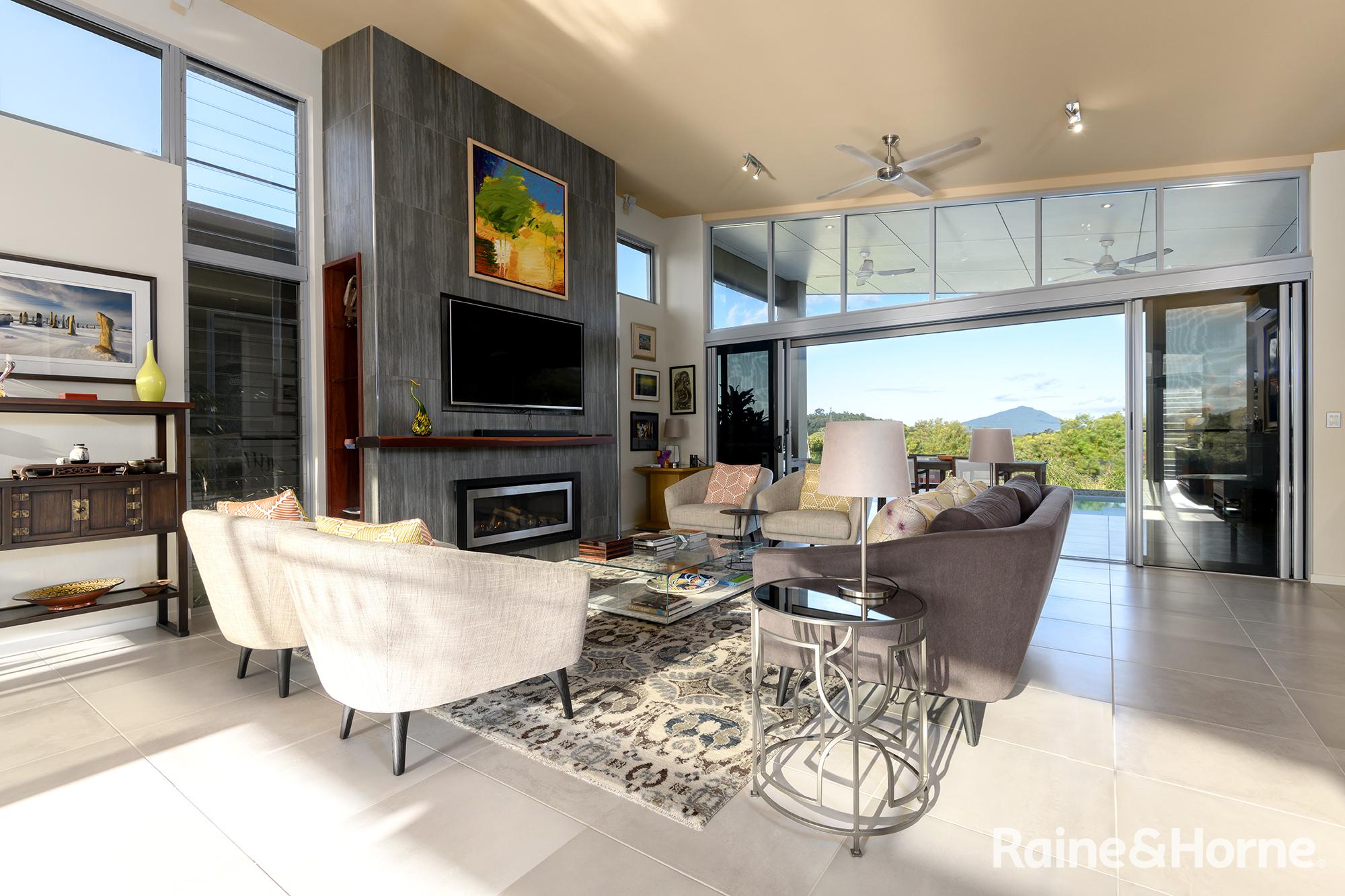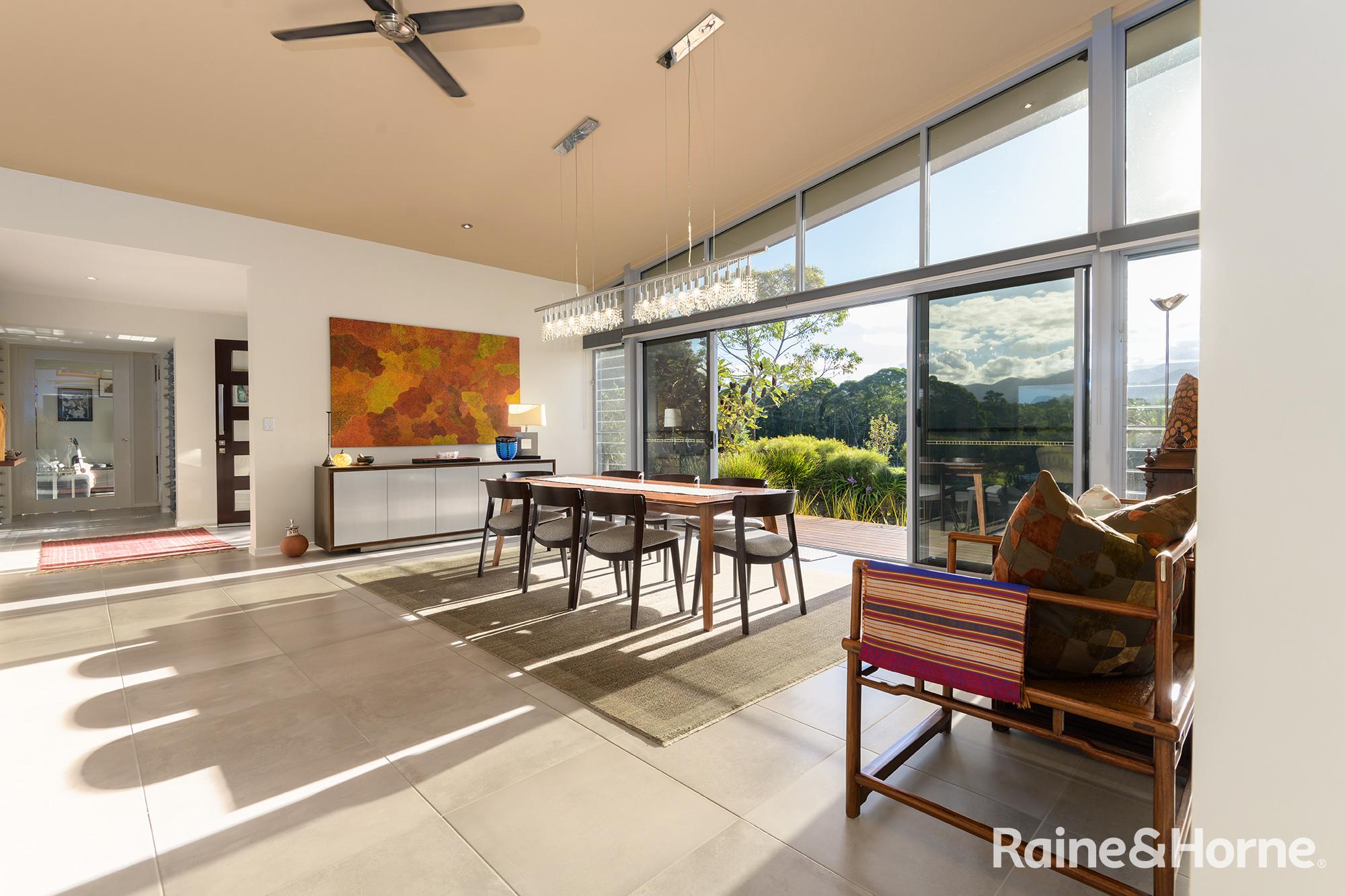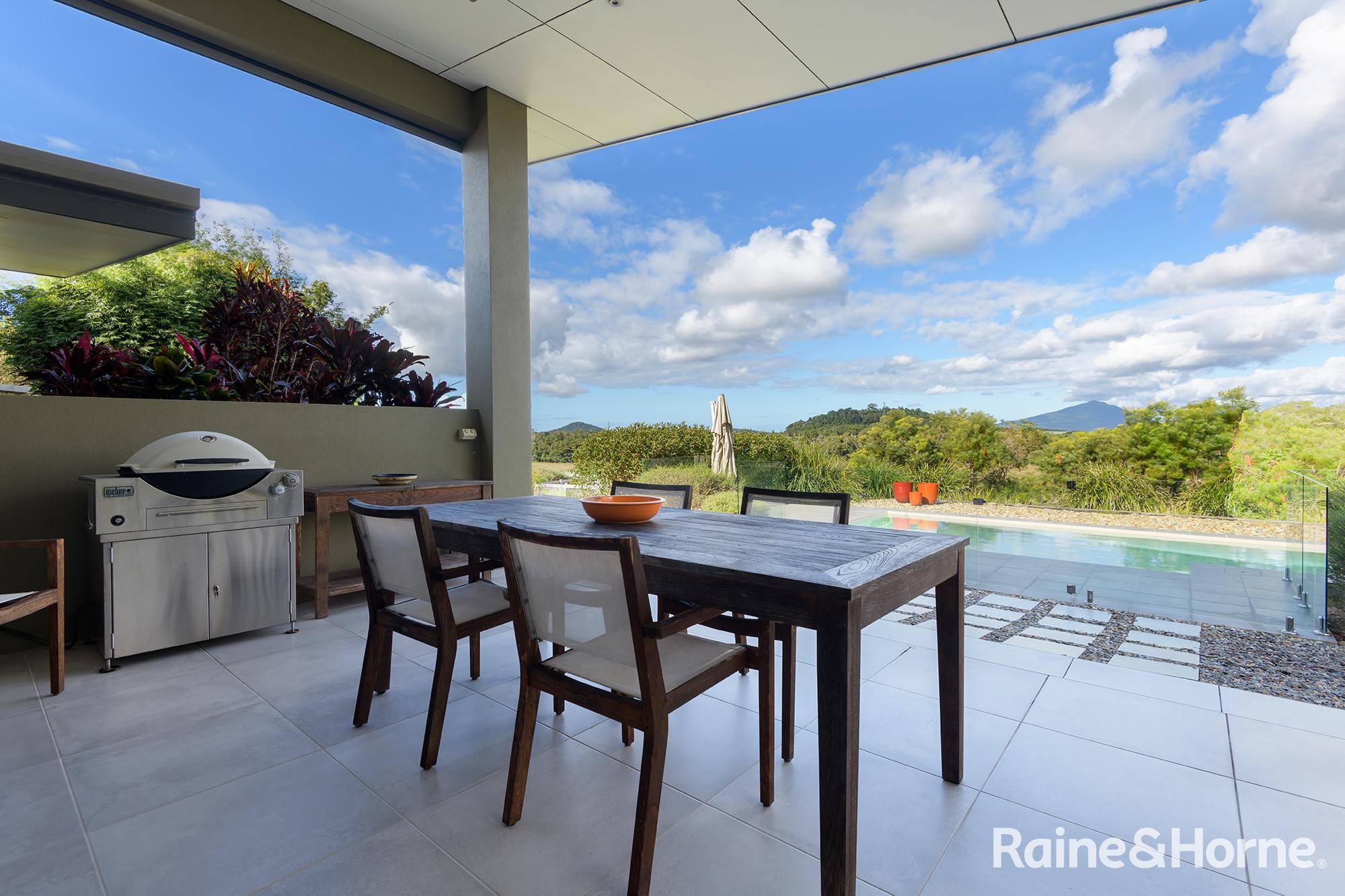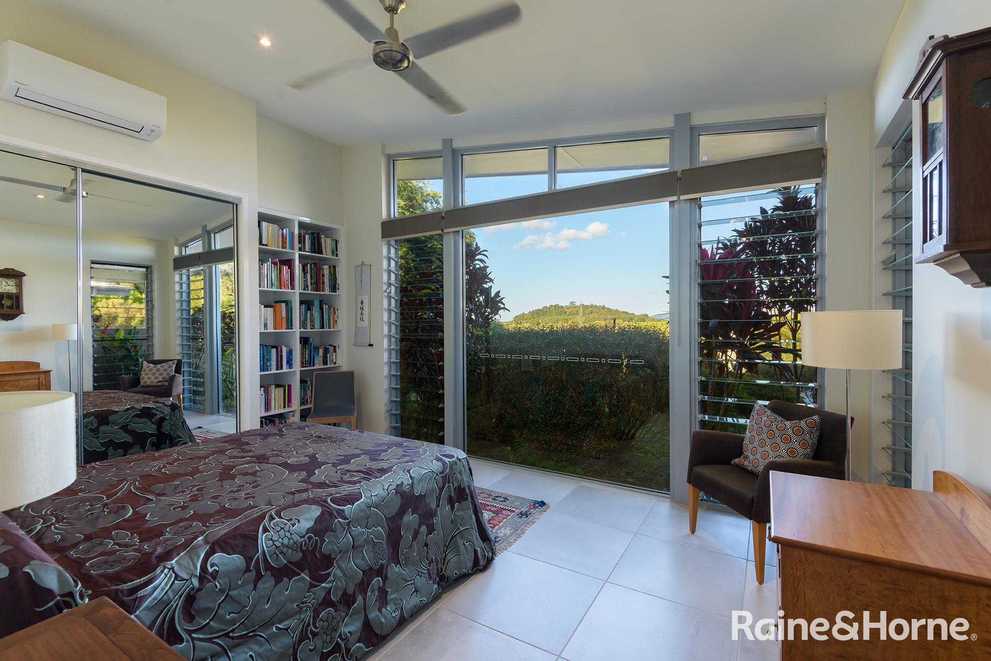 Summary • ~15 hectare property with creek at side and rear, views to Black Mountain and rainforest to the side along the creek line • House was a new build in 2016 and specifically designed for the site to make most of views of Black Mountain and the range and the prevailing breezes with louvred breezeways separating the bedroom wings from the kitchen, living and dining areas