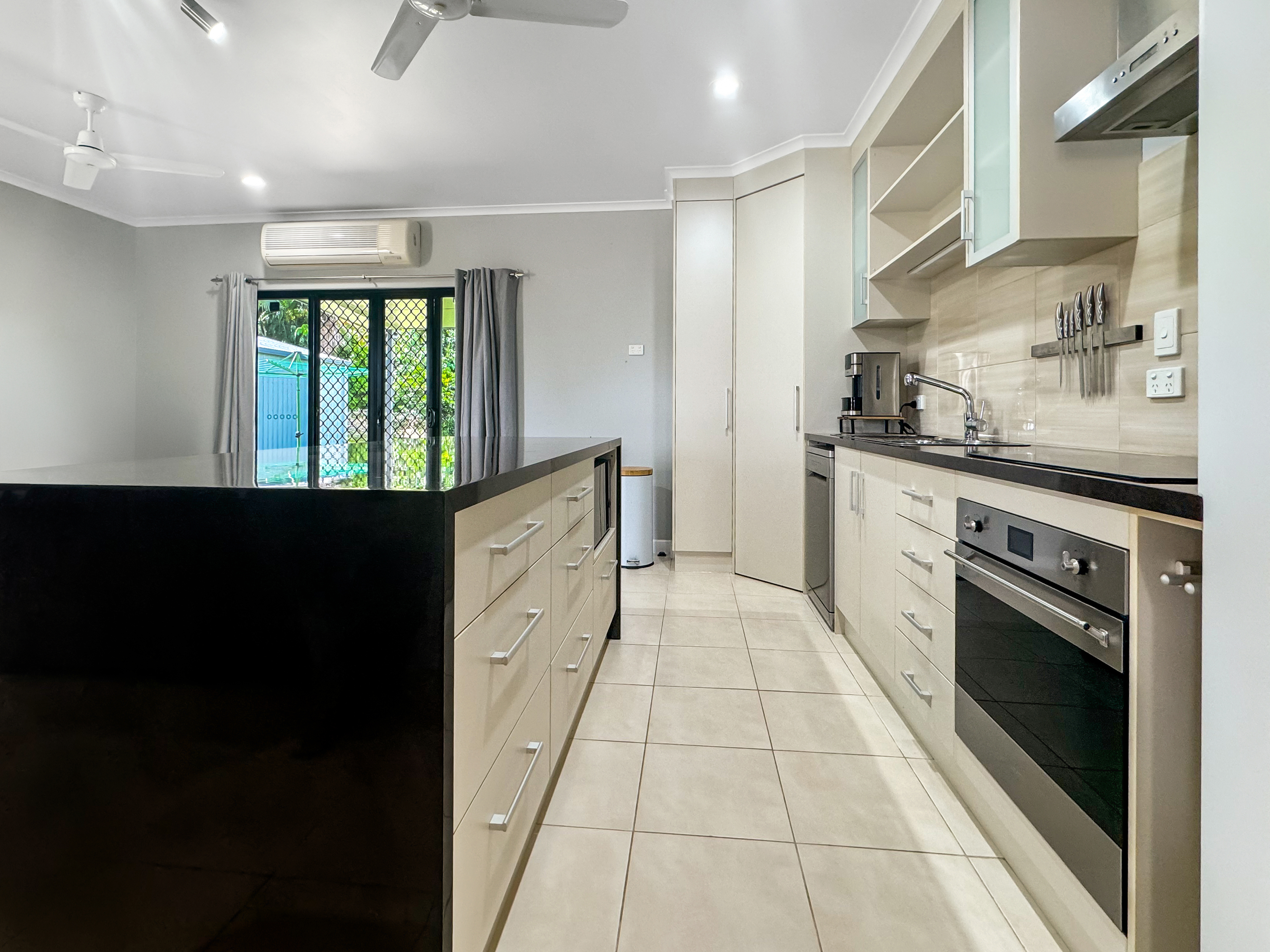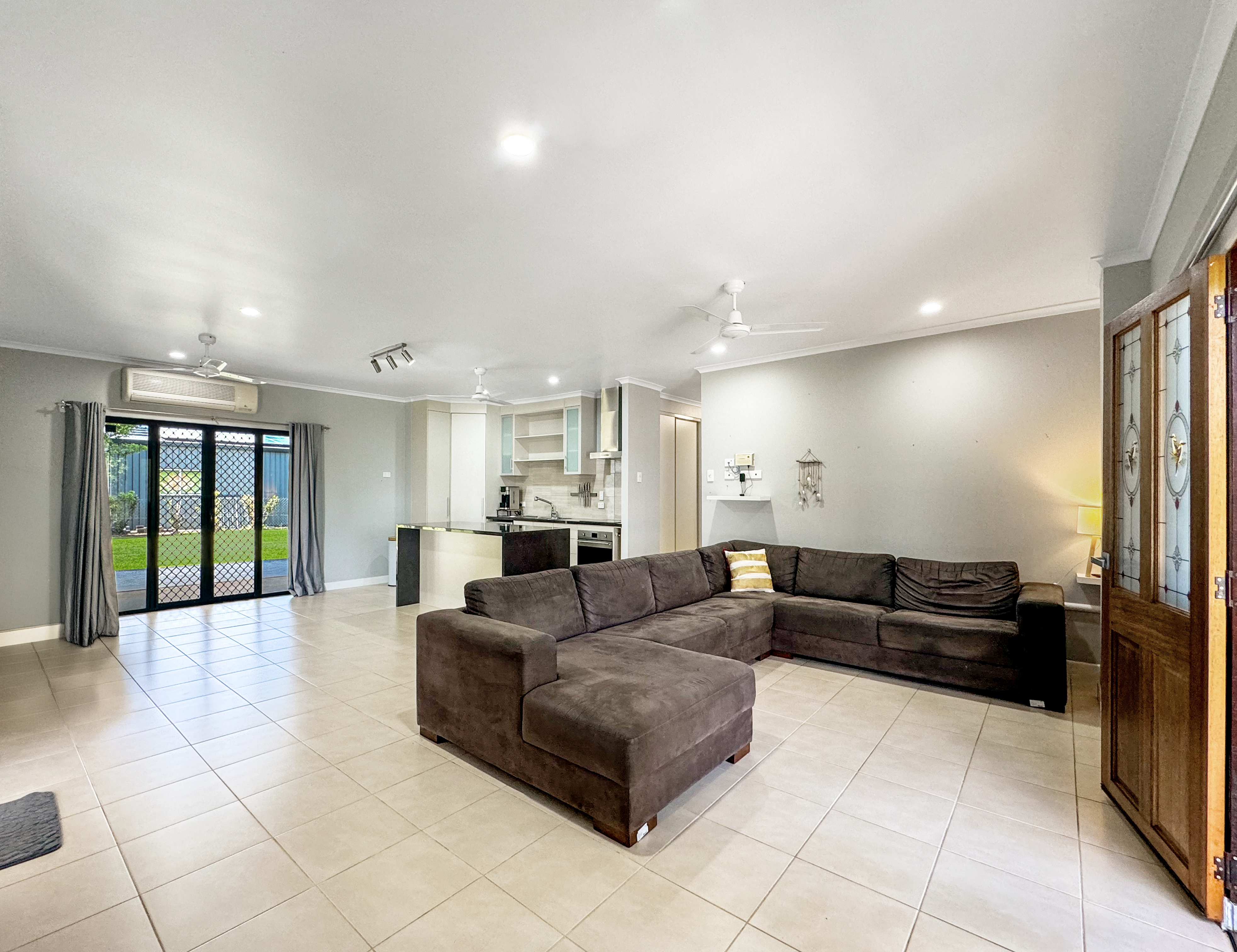 The heart of the home is the state-of-the-art open-plan kitchen outfitted with an induction cooktop, wall oven, and ample bench space. The living areas, adorned with low-maintenance tiled floors and secured with modern security screens, provide a safe and stylish environment for family gatherings.