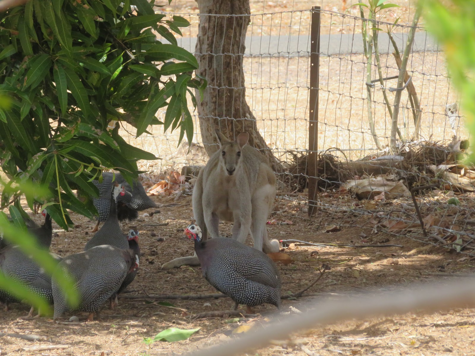 An array of Guinea Fowls and friendly wallaby that hangs here sometimes.